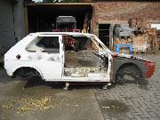 Seit dem 22.02.03.bin ich im besitz eines Golf 1 von 1977 . Der letzte Besitzer wollte ihn wieder herrichten und hatt aber die lust und zeit nicht mehr und deshalb konnte ich ihn günstig von ihn ersteigern . Mitbekommen habe ich alles ausser Motor und Getriebe , da sie leider den Motor kaputt gefahren hatten . Zurzeit bin ich dabei ihn zu entrosten und zu schweißen .